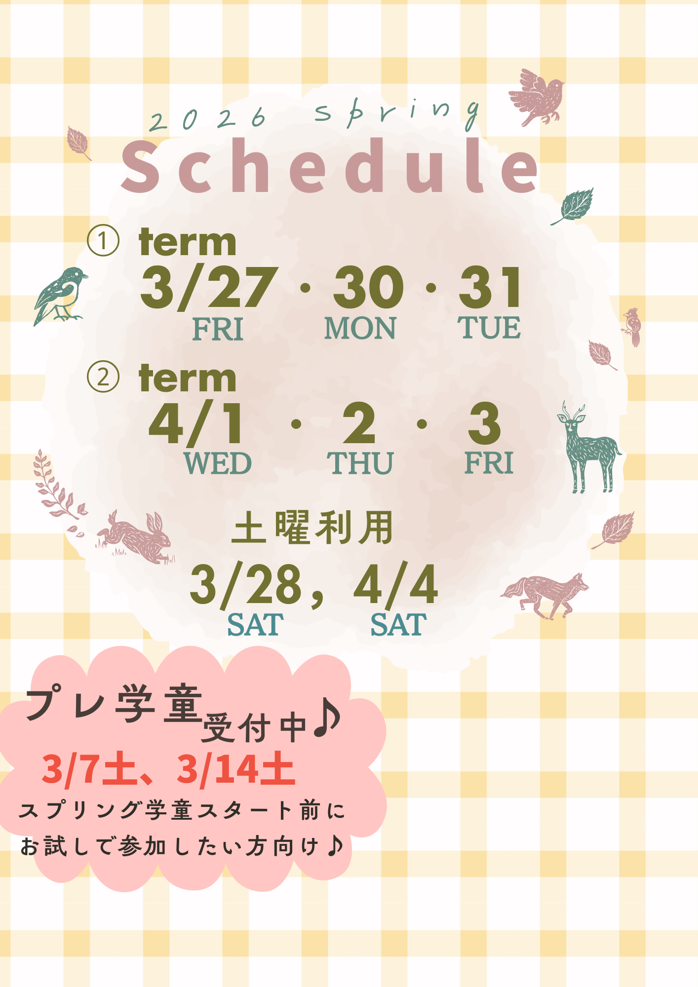 プレ学童:3/7 土、3/14 土